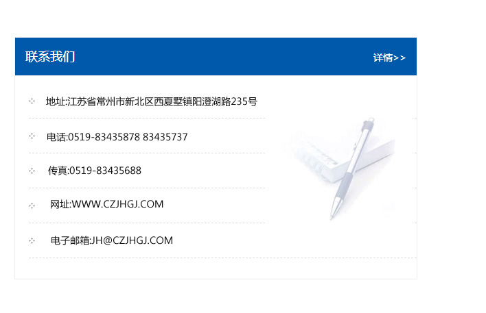 傳真:0519-83435688    郵編:213135    網址:WWW.czjhgj_com.mbasjtu.com    電子郵箱:JH@czjhgj_com.mbasjtu.com